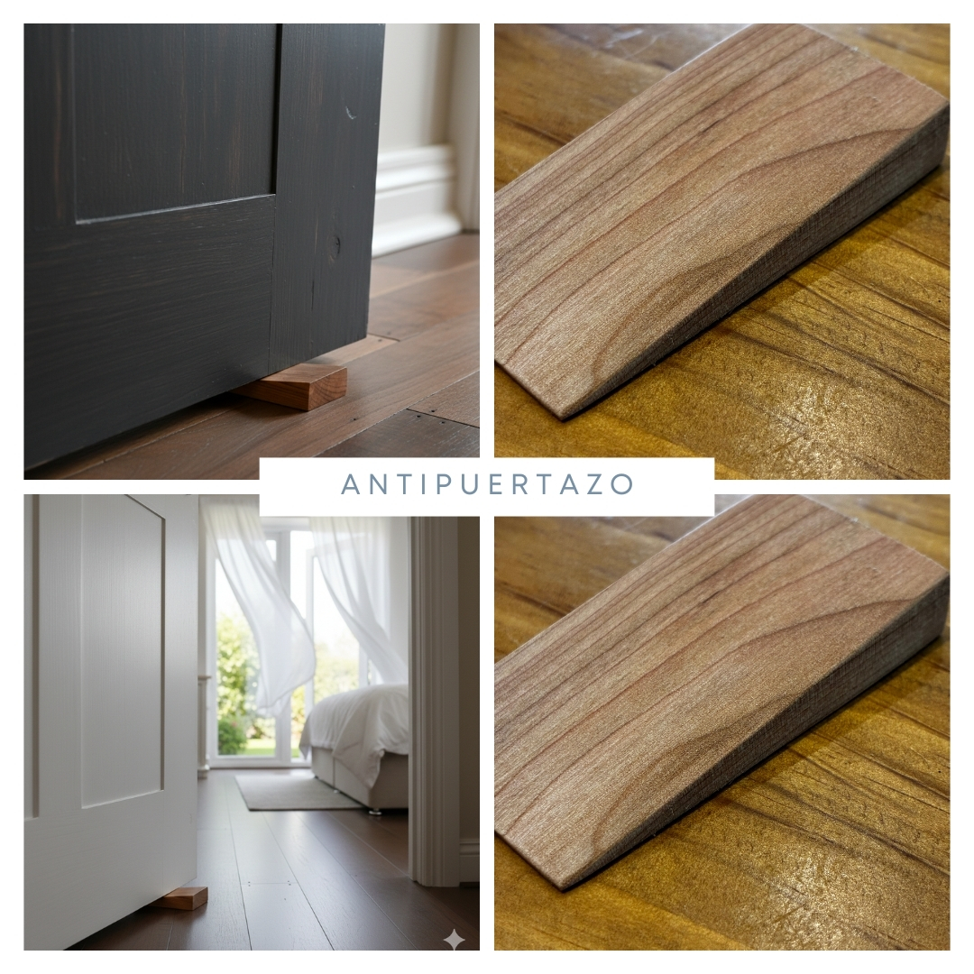 Incluye 4 cuñas de madera noble, diseñadas para mantener las puertas firmes, evitar movimientos bruscos, accidentes y reducir el ruido en espacios comunes.